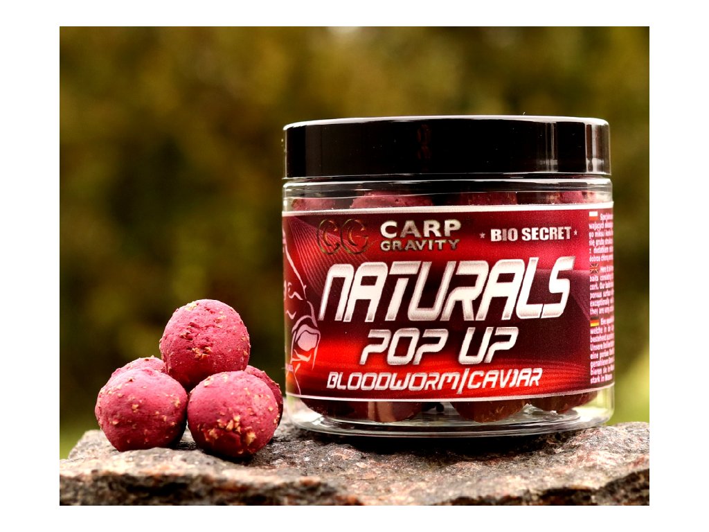 NATURALS Pop-Up 18 mm BLOODWORM/CAVIAR – prirodzene pôsobiace plávajúce boilies z prepálenej zmesi. Ideálne tam, kde fluorescenčné farby zlyhávajú.